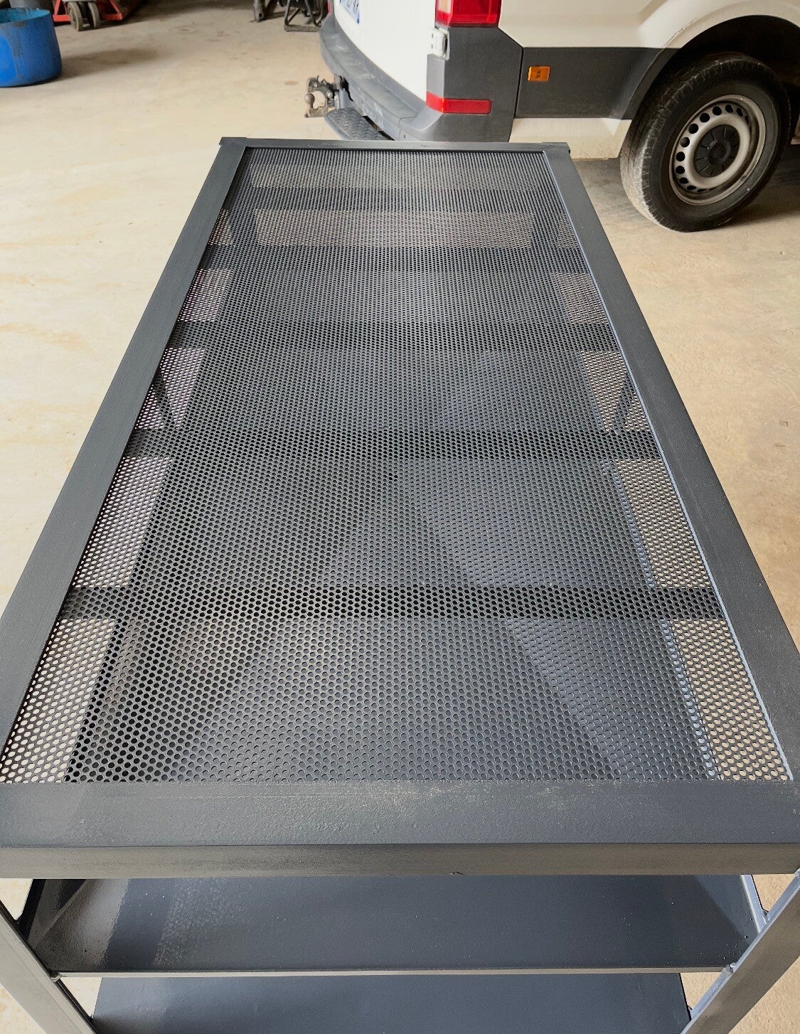 -Plateau en acier tôle percé en 4mm avec étagère. charge maximale du plateau : 500kg. Charge maximale de l'étagère 200kg